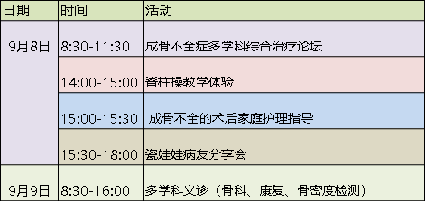 2018年9月8-9号,瓷娃娃中心联合华中科技大学同济医学院附属协和医院专家团队、香港大学深圳医院专家团队组建超豪华阵容在华中科技大学同济医学院附属协和医院为湖北及周边省份的病友带来一次多学科义诊(骨科、康复、骨密度检测)、更有脊柱操、手术后家庭护理指导课等着你!
